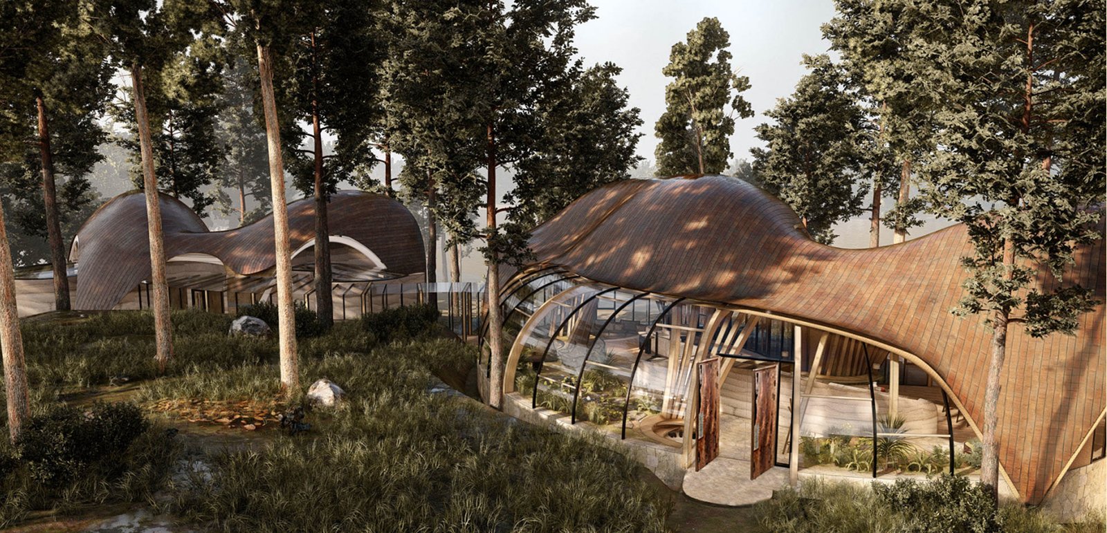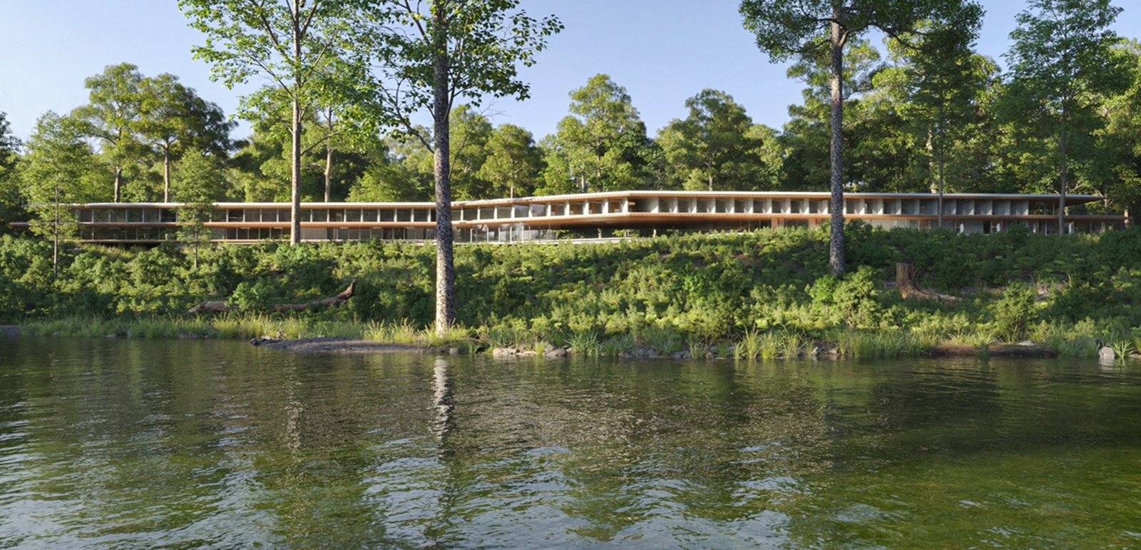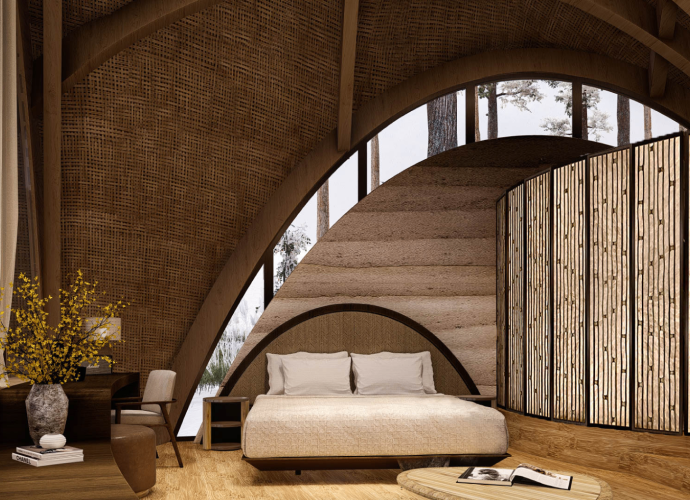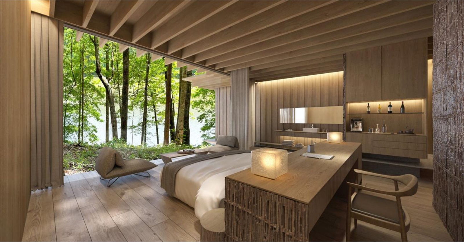 The Sleep Suites are Preserve Life’s primary hotel accommodations, featuring 50 identical units for 1–2 guests each. Ten suites are available for purchase by high-net-worth investors. Designed to follow the land’s natural contours, each 25' x 24' unit includes floor-to-ceiling glass with lake or forest views and integrated vibro-acoustic therapy. AI-powered, non-intrusive sensors track sleep patterns in real time to personalize wellness programs.