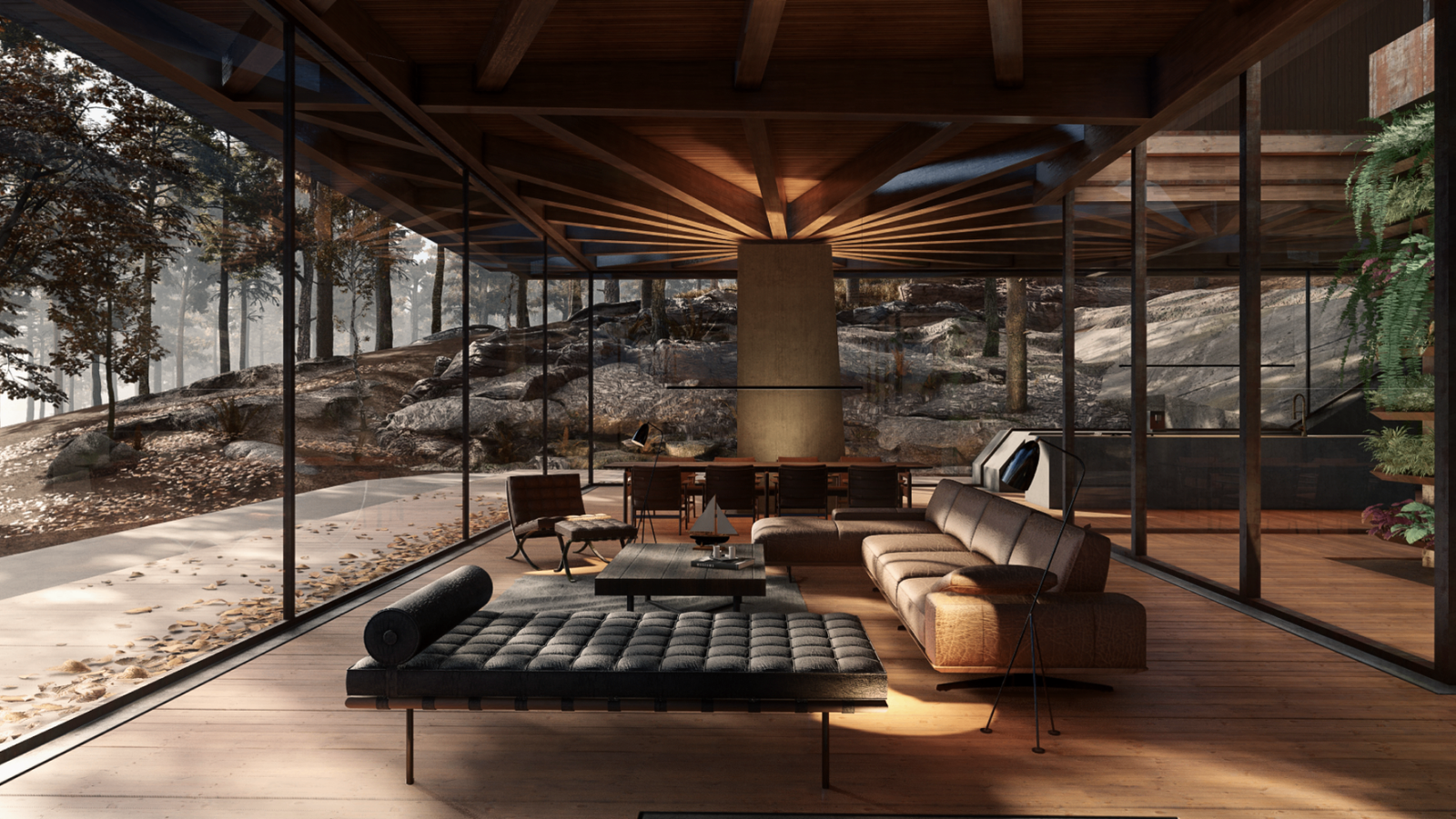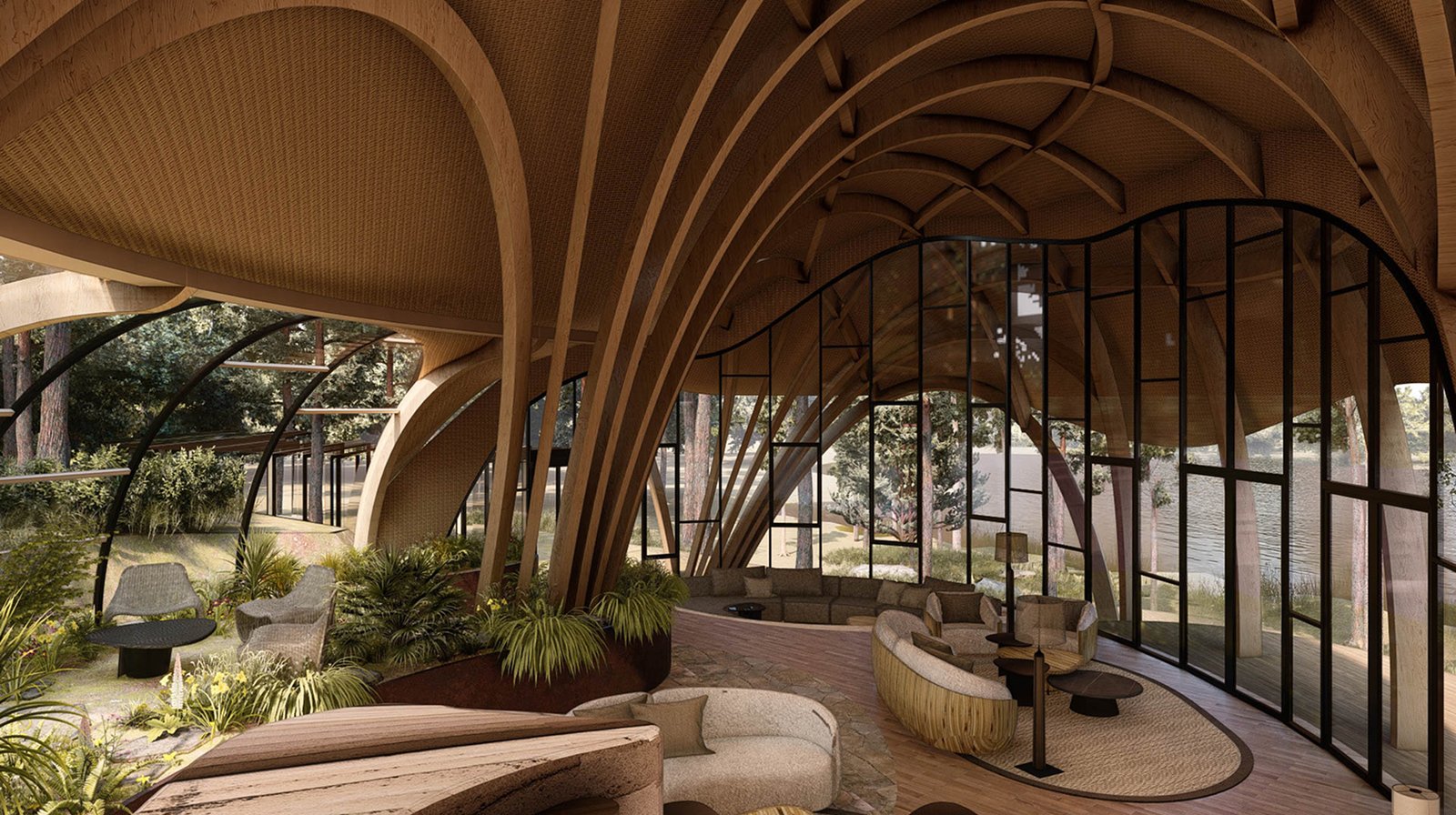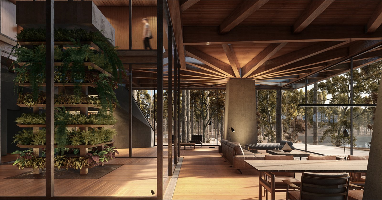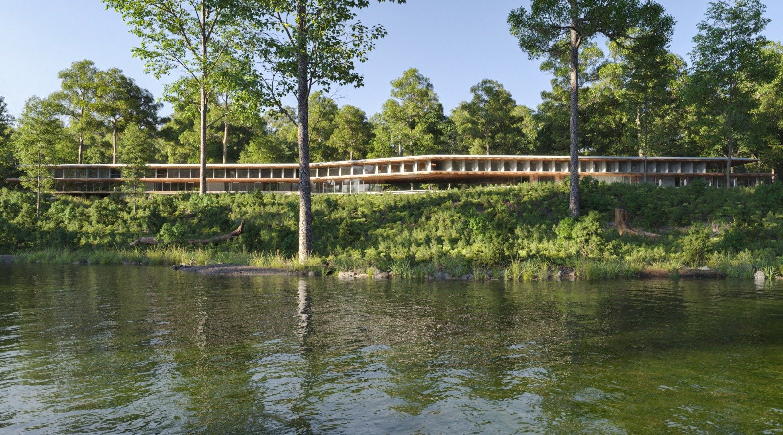 The Sleep Suites are Preserve Life’s primary hotel accommodations, featuring 50 identical units for 1–2 guests each. Ten suites are available for purchase by high-net-worth investors. Designed to follow the land’s natural contours, each 25' x 24' unit includes floor-to-ceiling glass with lake or forest views and integrated vibro-acoustic therapy. AI-powered, non-intrusive sensors track sleep patterns in real time to personalize wellness programs.